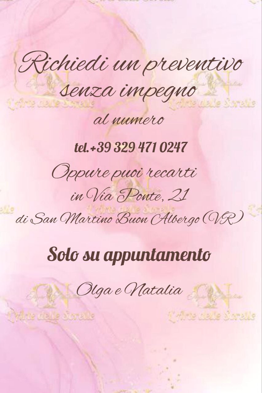 L’Arte delle Sorelle ti aspetta a San Martino B.A. (VR) in via Ponte 21. Per una consulenza personalizzata o per fissare un appuntamento, contattaci telefonicamente al numero +39 329 471 0247. Affidati alla professionalità e alla passione di Olga e Natalia per trasformare il tuo grande giorno in un’esperienza indimenticabile, dove ogni dettaglio è pensato per esaltare la tua bellezza e renderti davvero unica.
